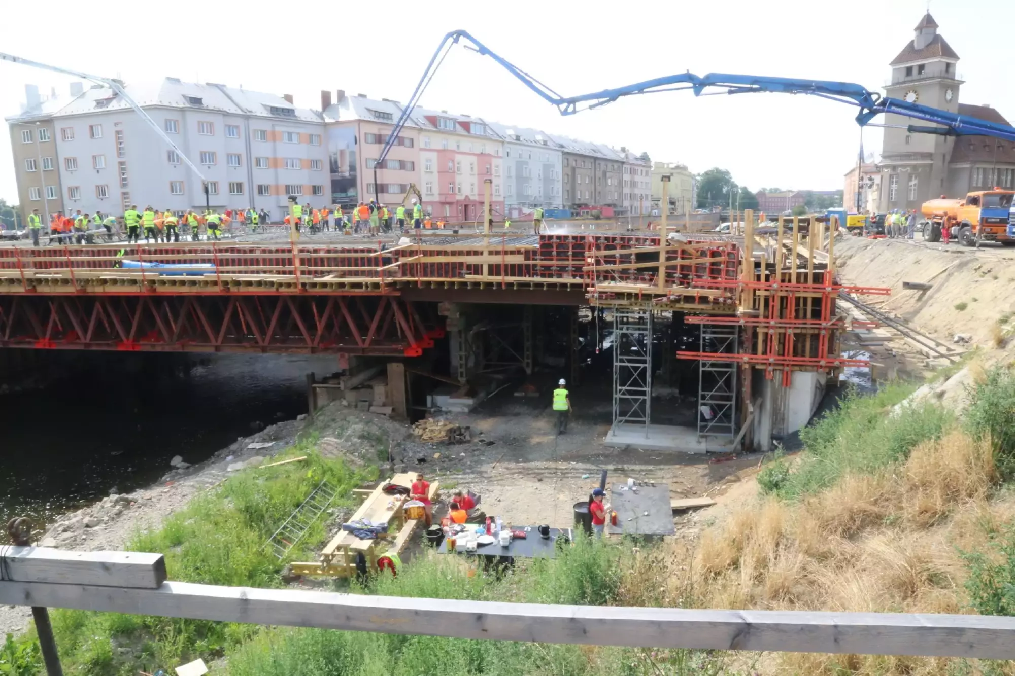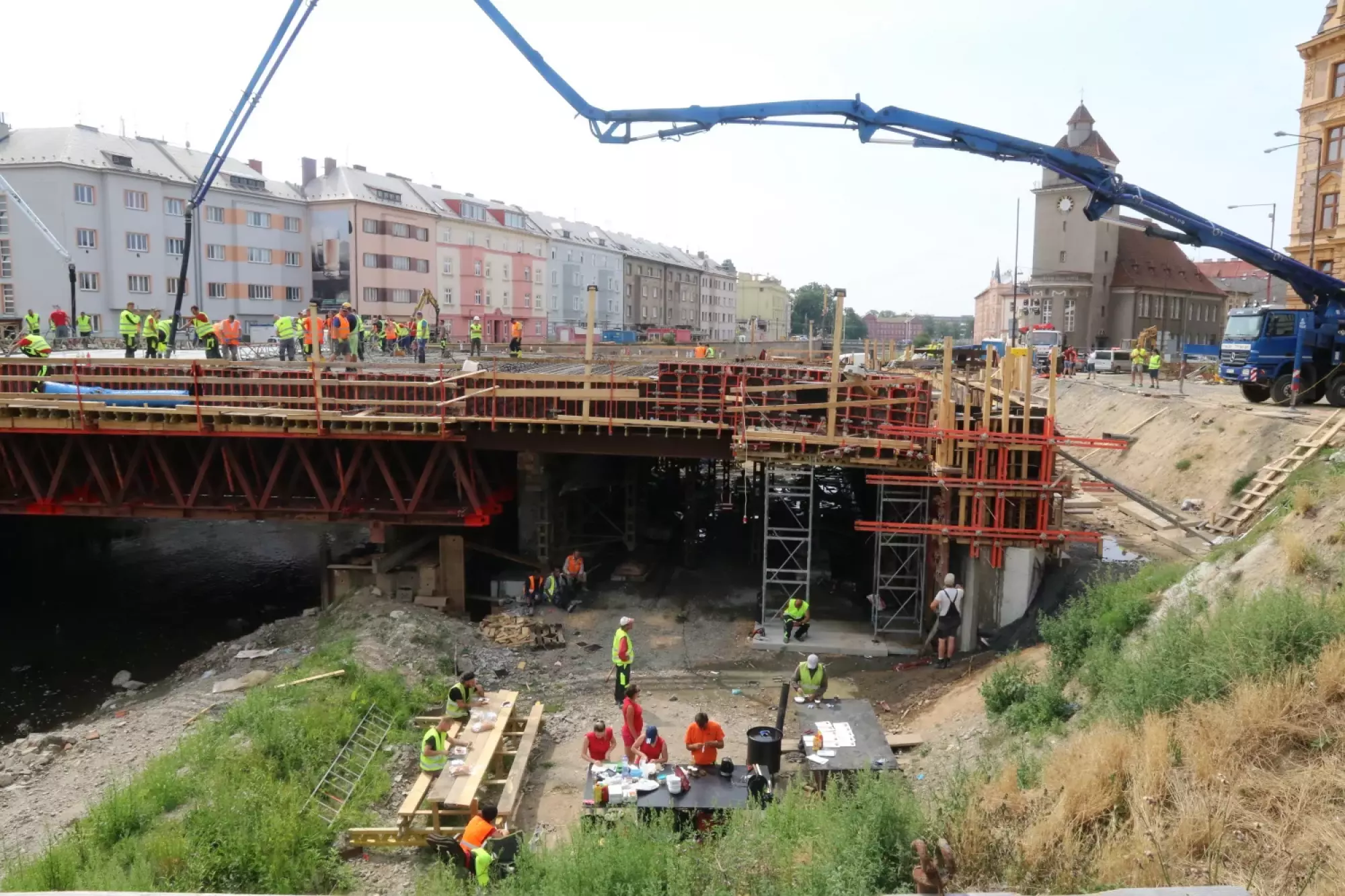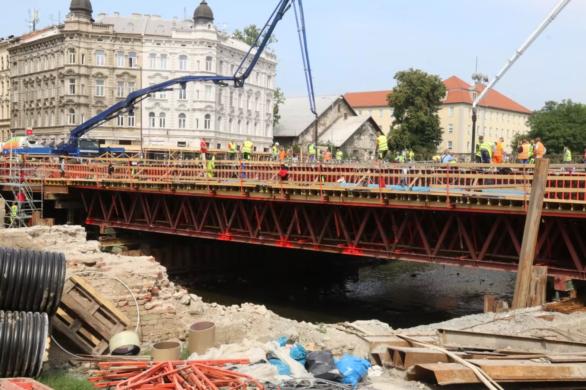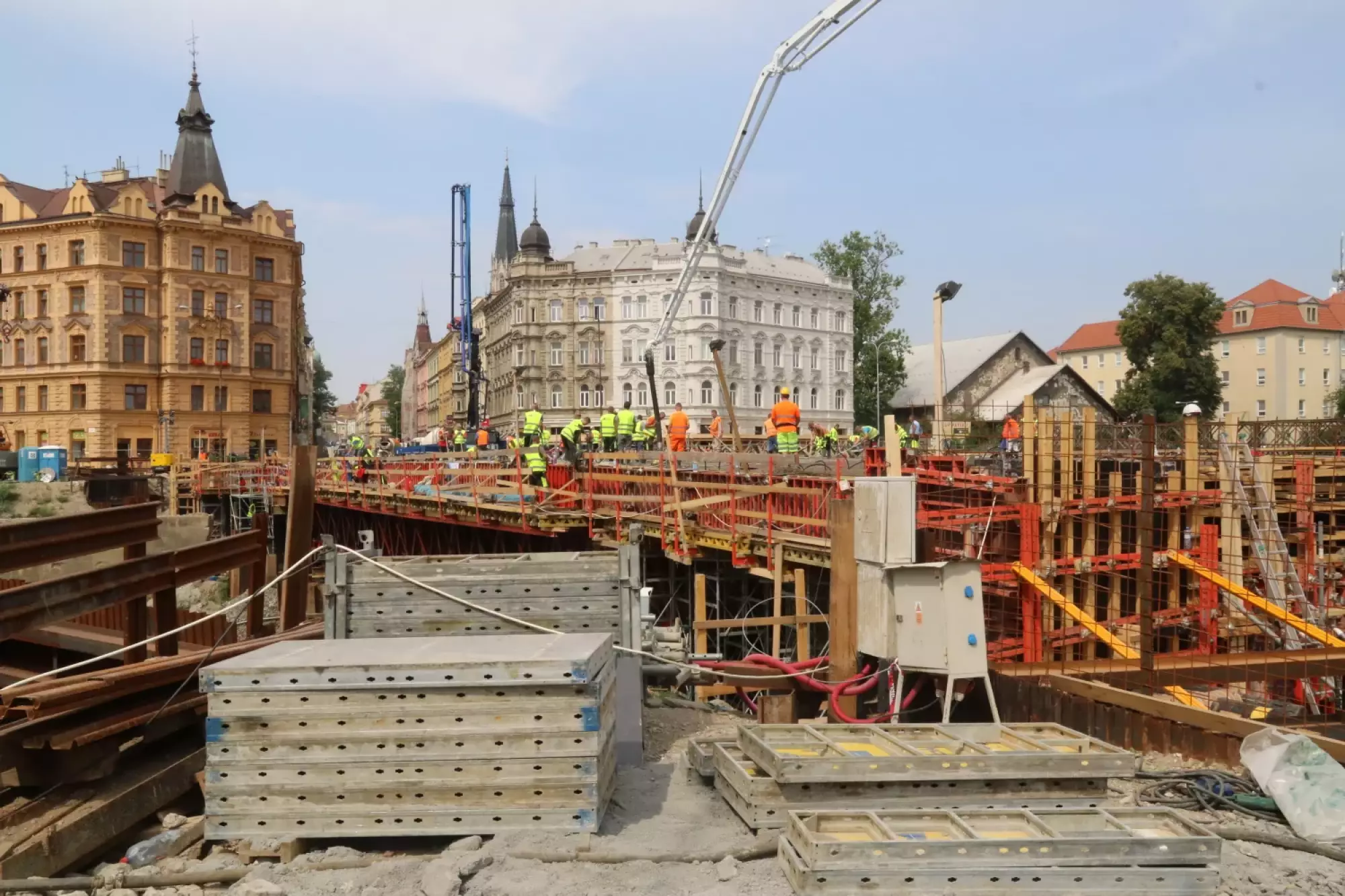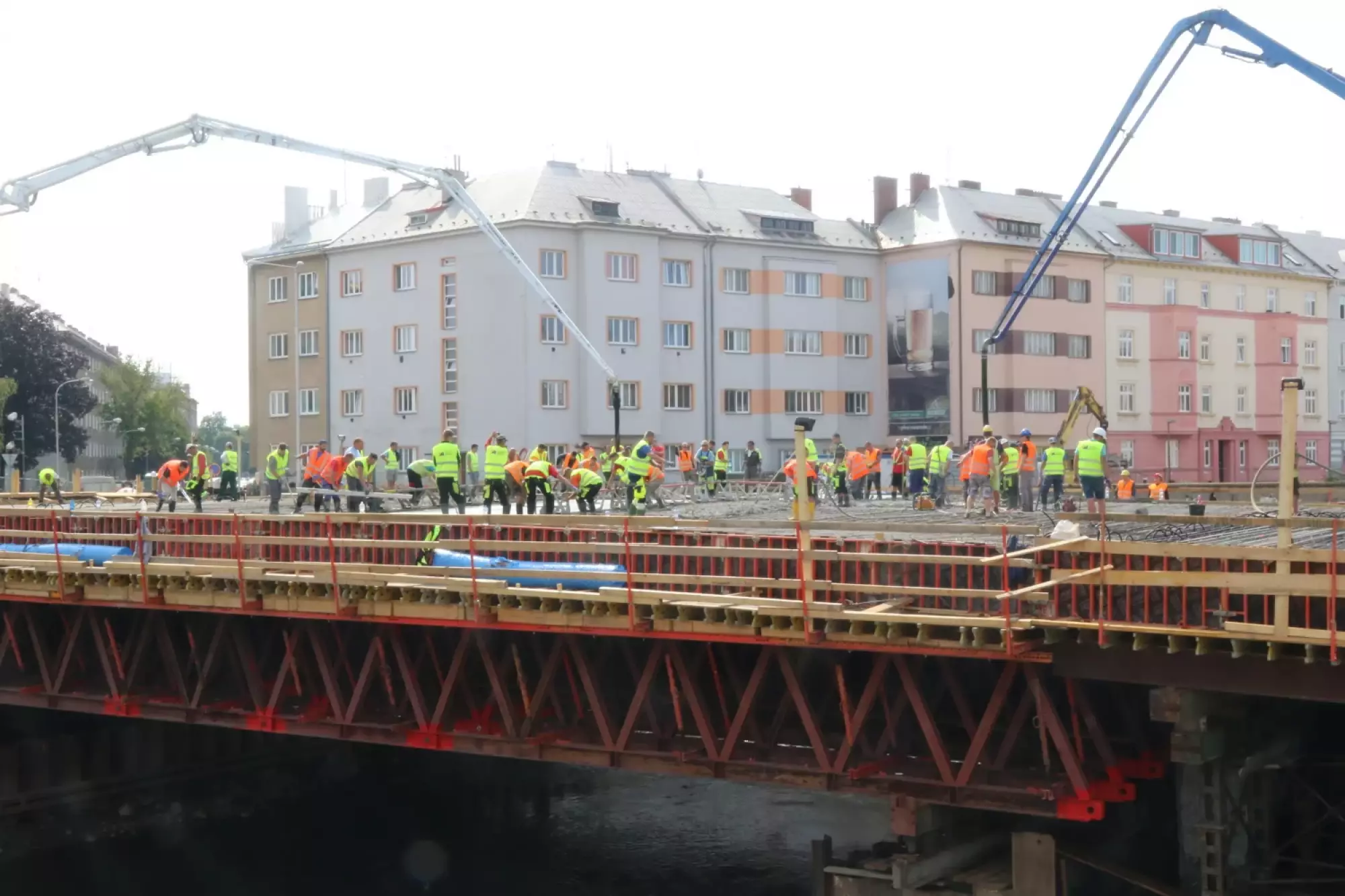 Nepřetržité betonování probíhá v těchto hodinách na stavbě mostu v Komenského ulici. Desítky dělníků začaly připravovat mimořádnou stavební akci už v noci ze čtvrtka na pátek, brzy ráno pak přivezly první domíchávače beton. Od šesti ráno se střídá jeden domíchávací vůz za druhým, aby mohly stovky kubických metrů betonu nepřetržitě natékat do připravené mostní konstrukce. Práce bude pokračovat zřejmě až do noci.