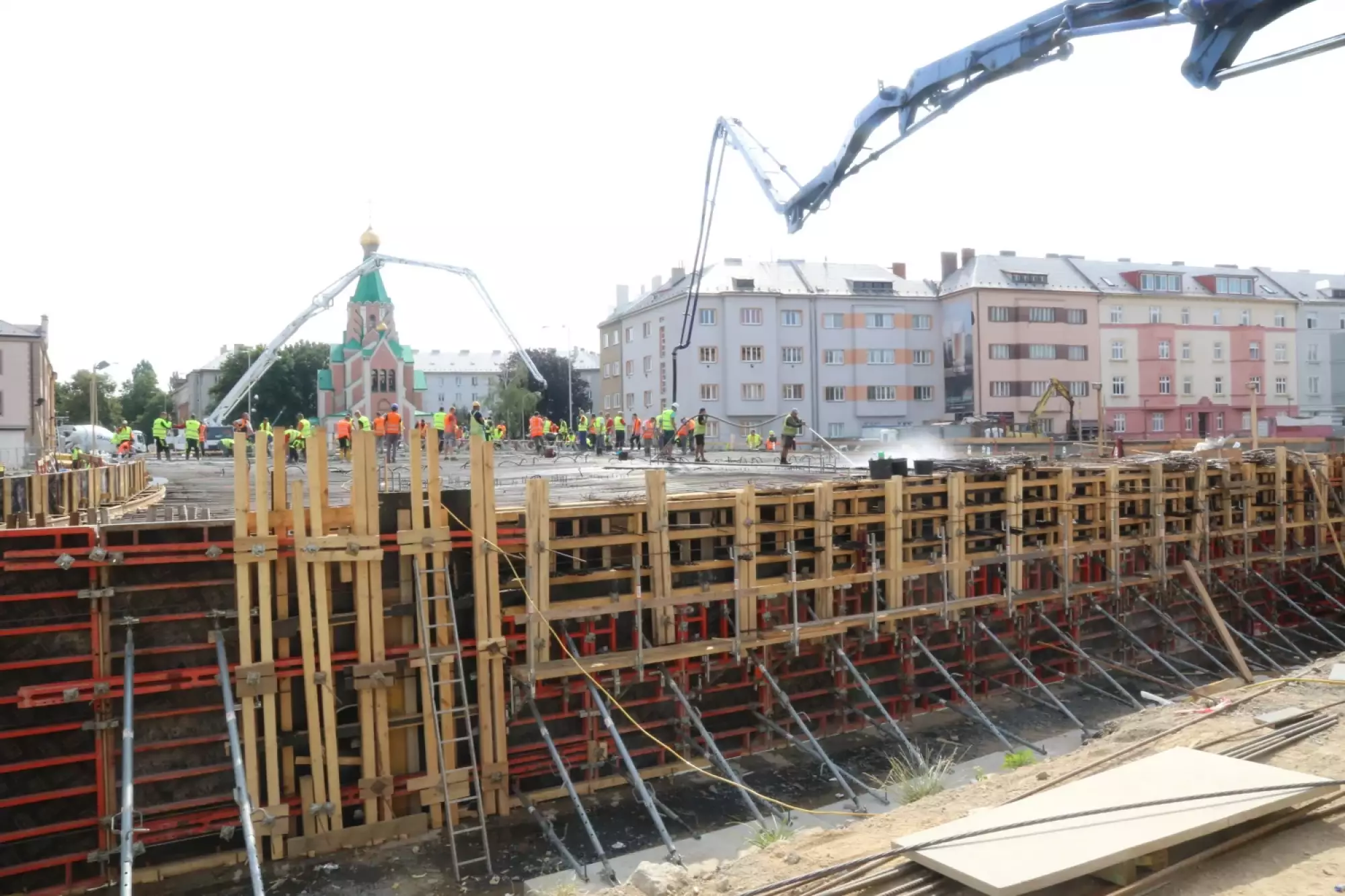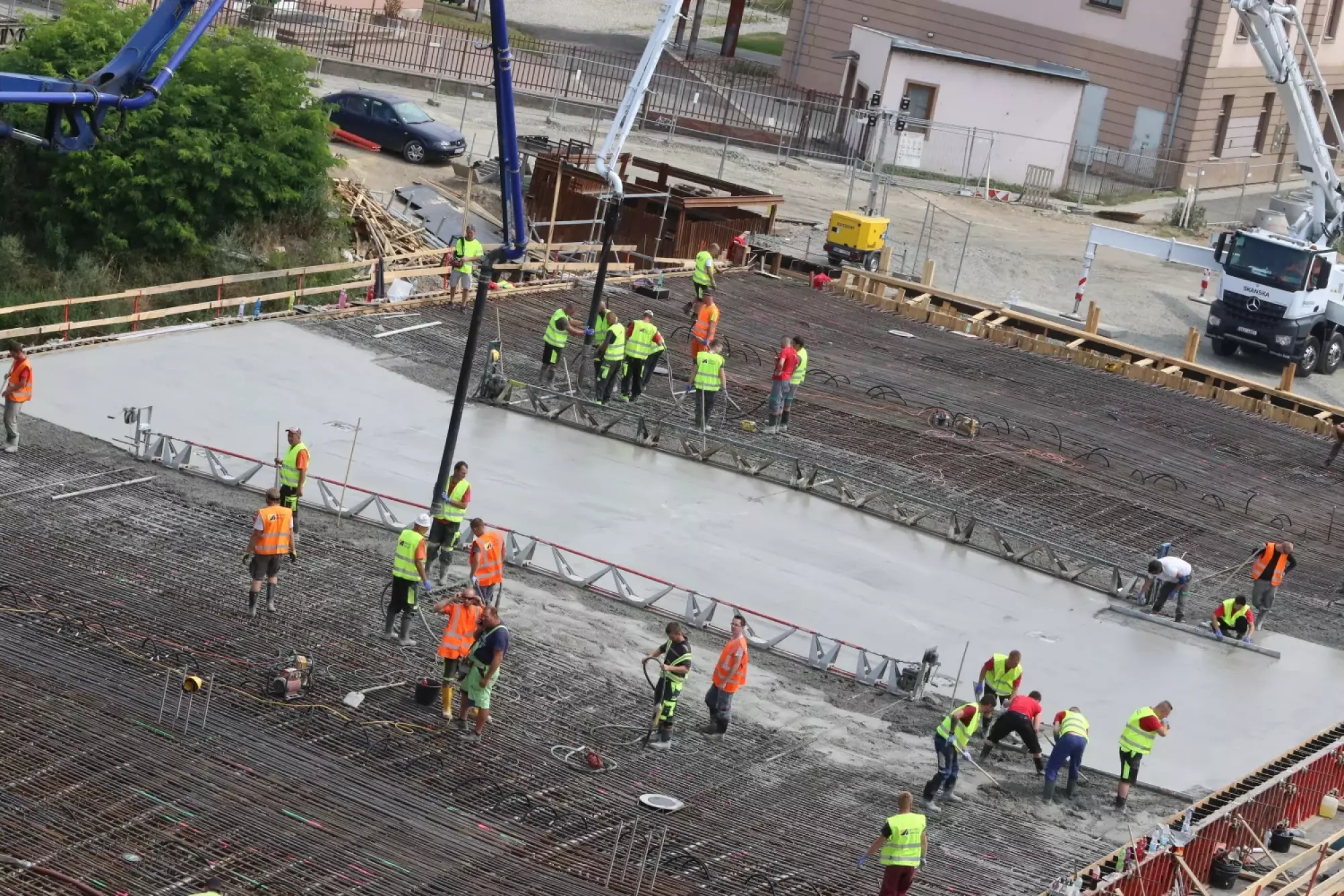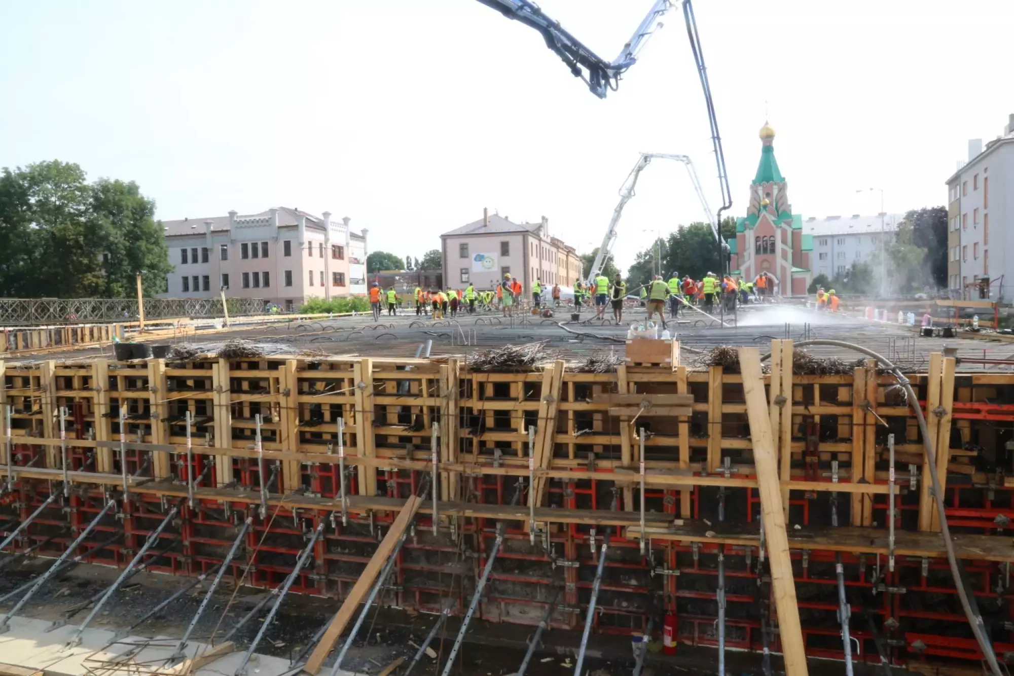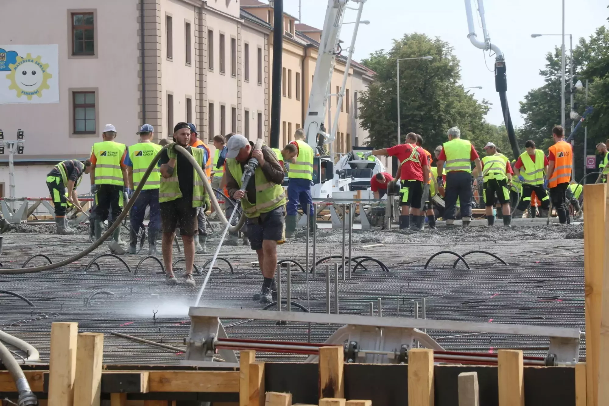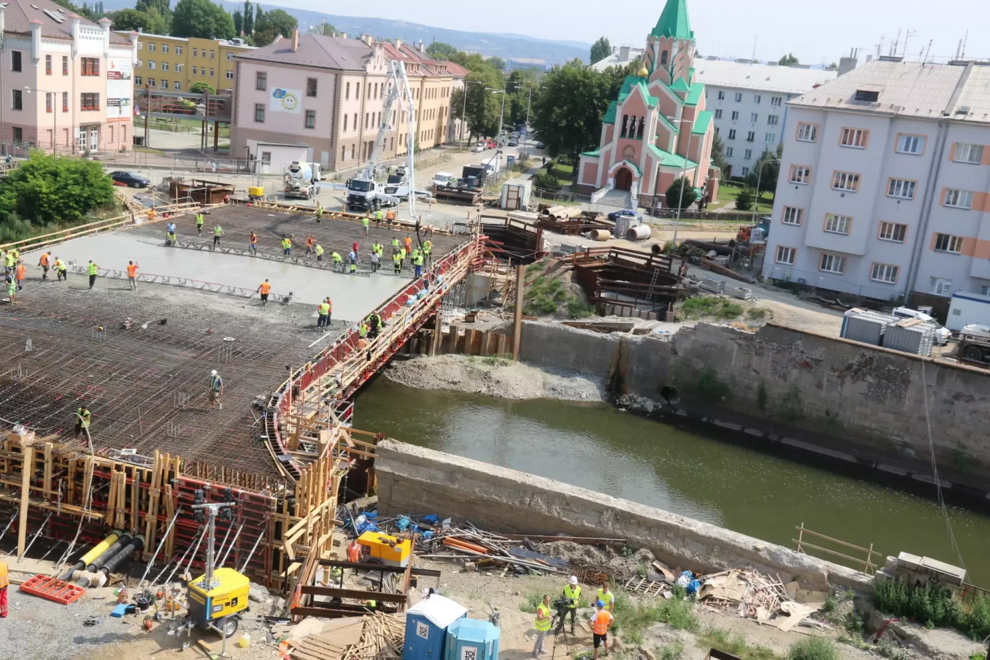 Nepřetržité betonování probíhá v těchto hodinách na stavbě mostu v Komenského ulici. Desítky dělníků začaly připravovat mimořádnou stavební akci už v noci ze čtvrtka na pátek, brzy ráno pak přivezly první domíchávače beton. Od šesti ráno se střídá jeden domíchávací vůz za druhým, aby mohly stovky kubických metrů betonu nepřetržitě natékat do připravené mostní konstrukce. Práce bude pokračovat zřejmě až do noci.