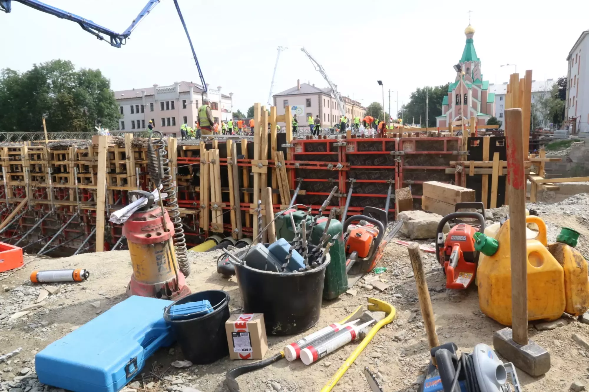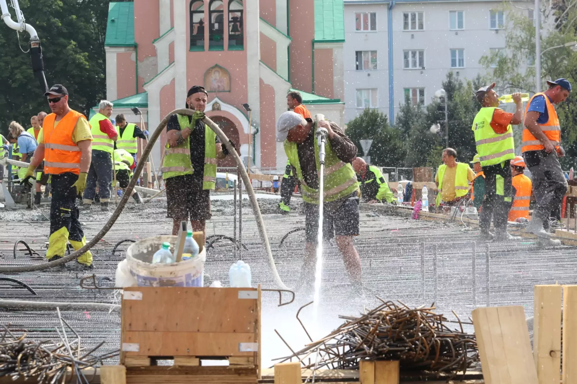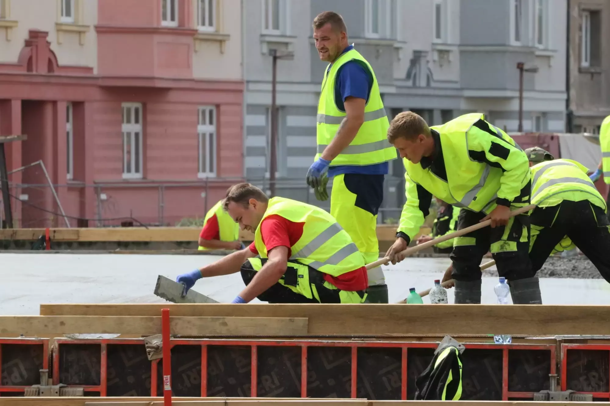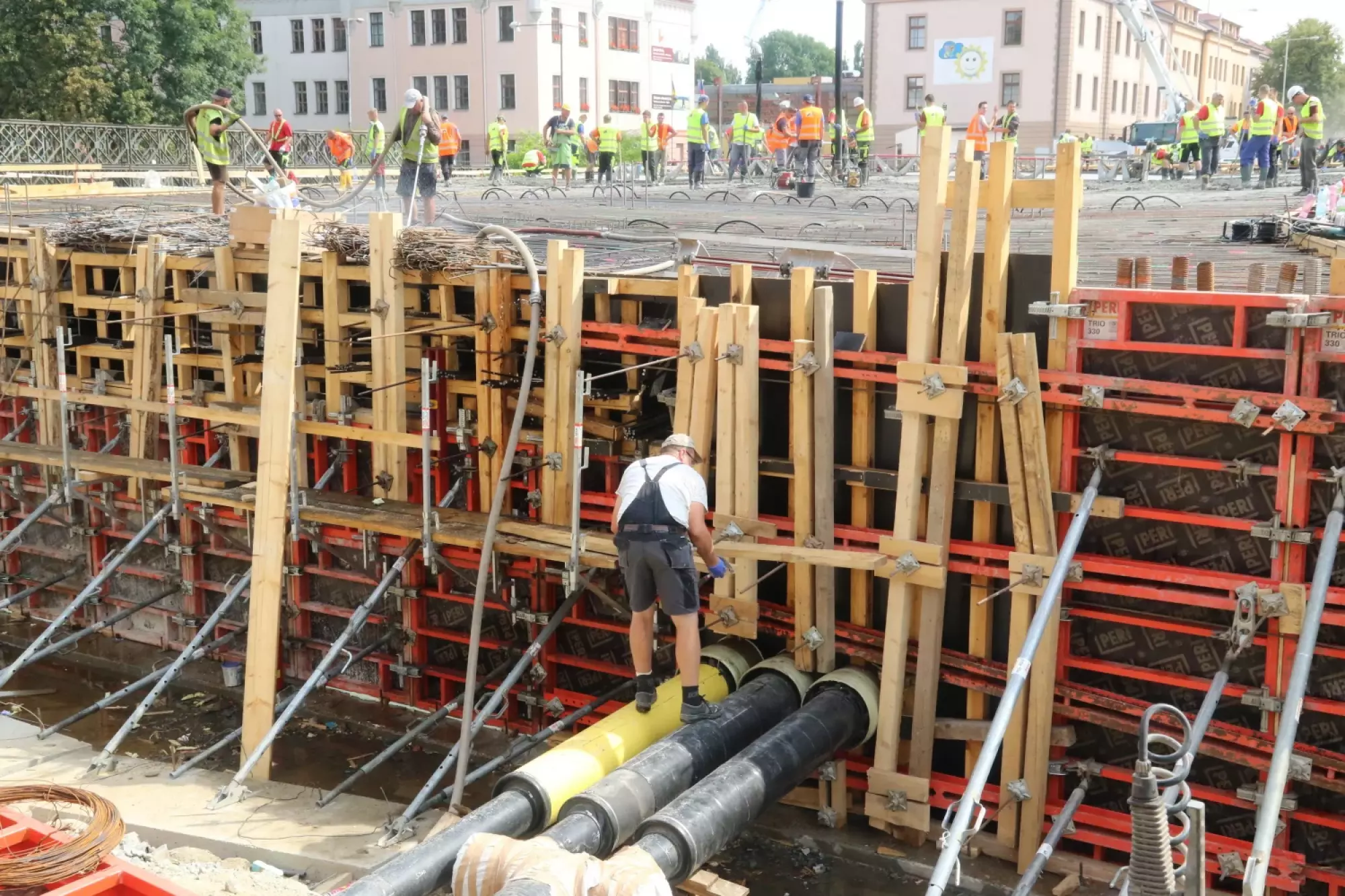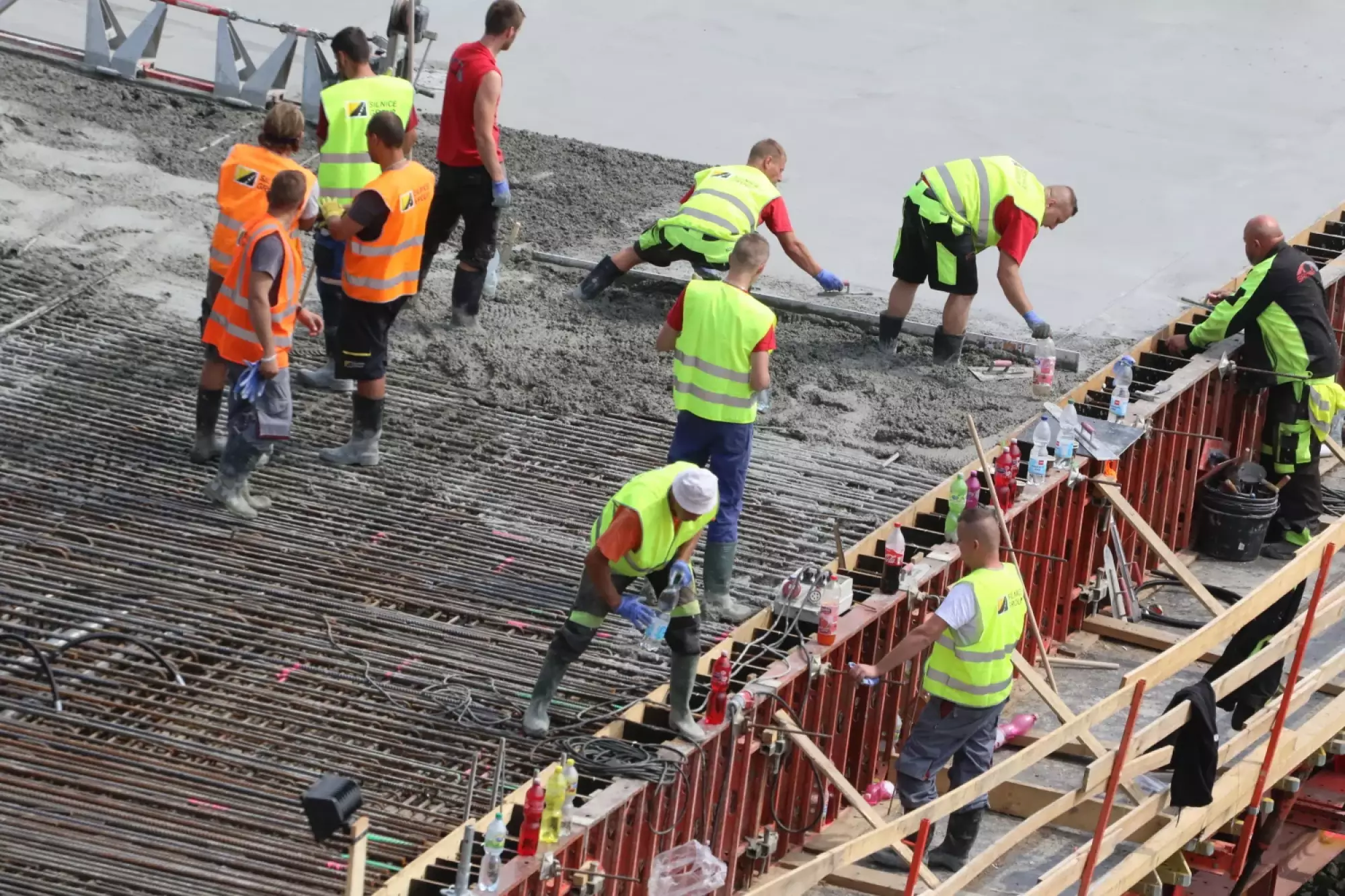 Nepřetržité betonování probíhá v těchto hodinách na stavbě mostu v Komenského ulici. Desítky dělníků začaly připravovat mimořádnou stavební akci už v noci ze čtvrtka na pátek, brzy ráno pak přivezly první domíchávače beton. Od šesti ráno se střídá jeden domíchávací vůz za druhým, aby mohly stovky kubických metrů betonu nepřetržitě natékat do připravené mostní konstrukce. Práce bude pokračovat zřejmě až do noci.