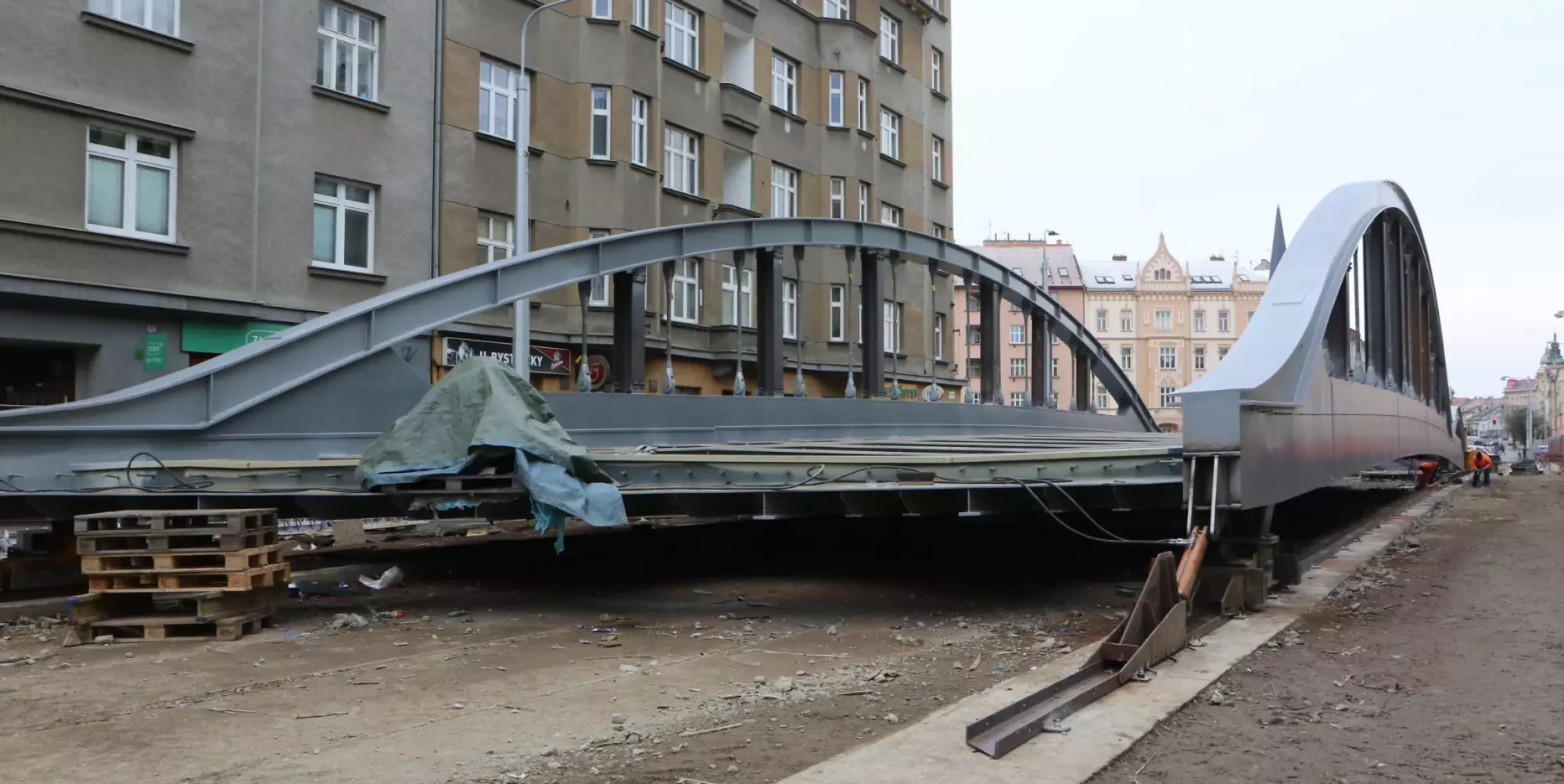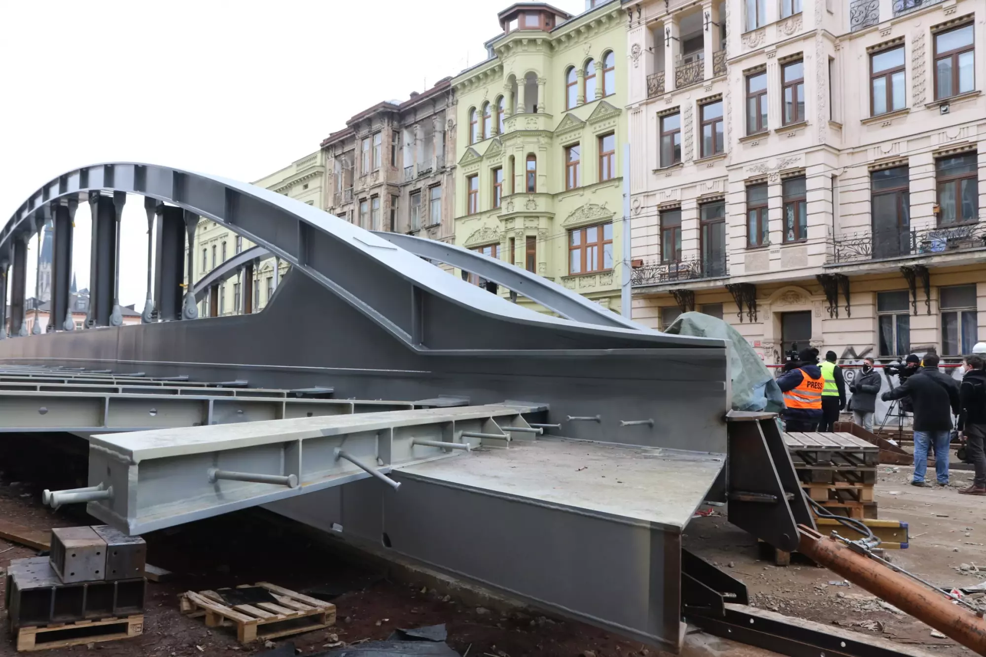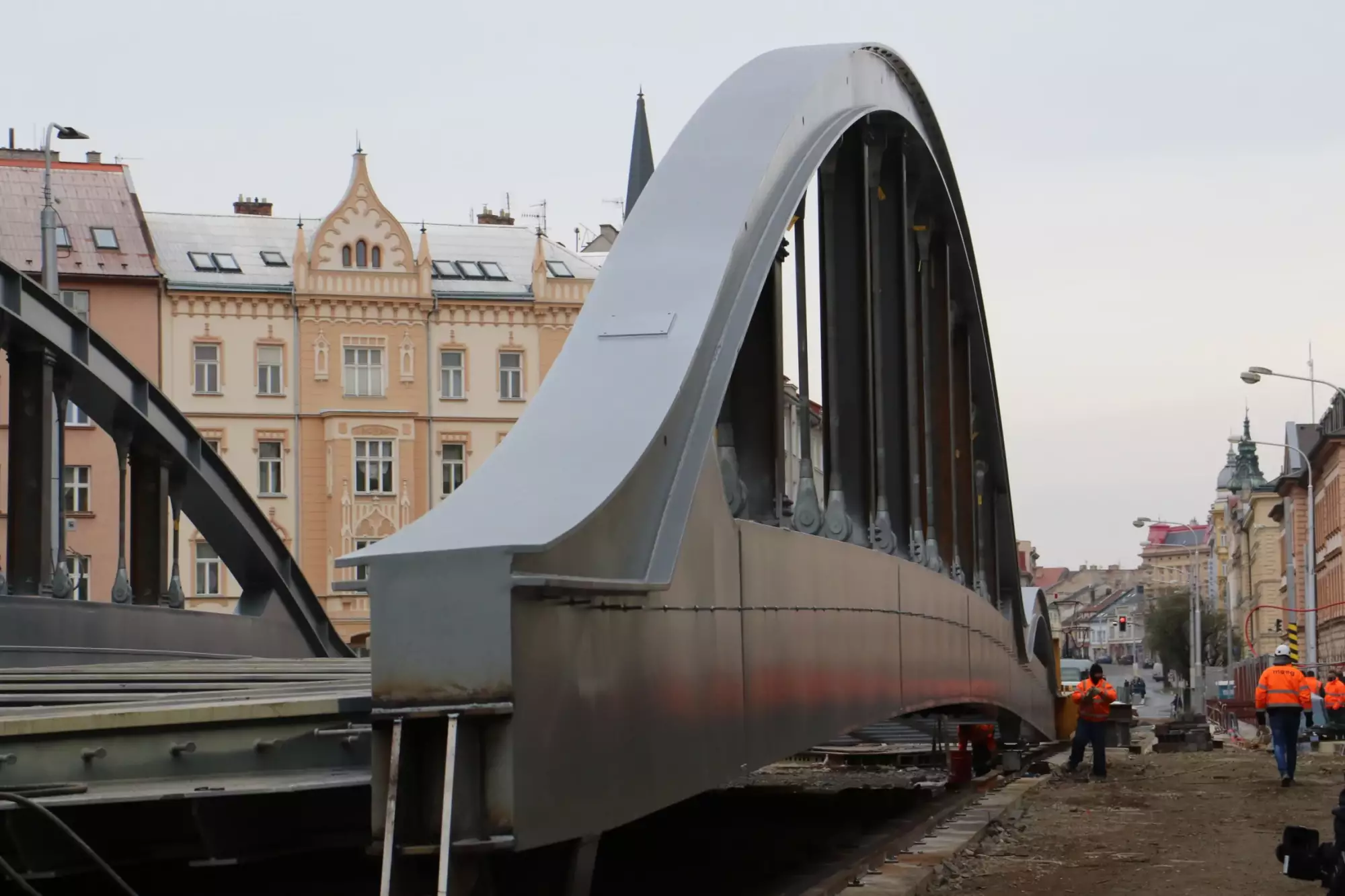 Konstrukce mostu na Masarykově třídě v Olomouci se začala ve čtvrtek 10. prosince vysouvat z ulice nad hladinu. Jedná se o ojedinělý technologický krok, protože kovová konstrukce poloviny mostu váží zhruba 295 tun, s přídavnou pomocnou konstrukcí dokonce 320 tun. Vysouvání bude trvat asi deset dní, během této doby bude z bezpečnostních důvodů uzavřena i lávka pro pěší. Chodci musí zvolit náhradní trasu přes most v Komenského ulici. Nicméně dnes zatím ještě přes lávku procházet mohli.