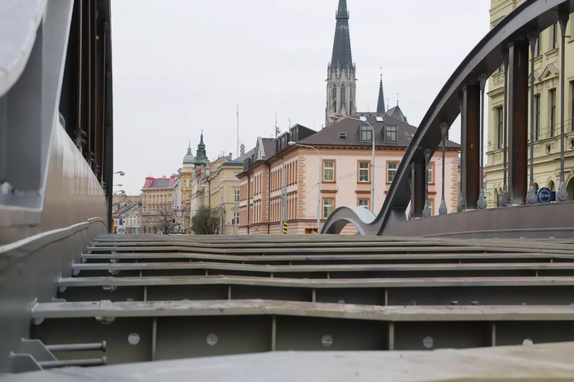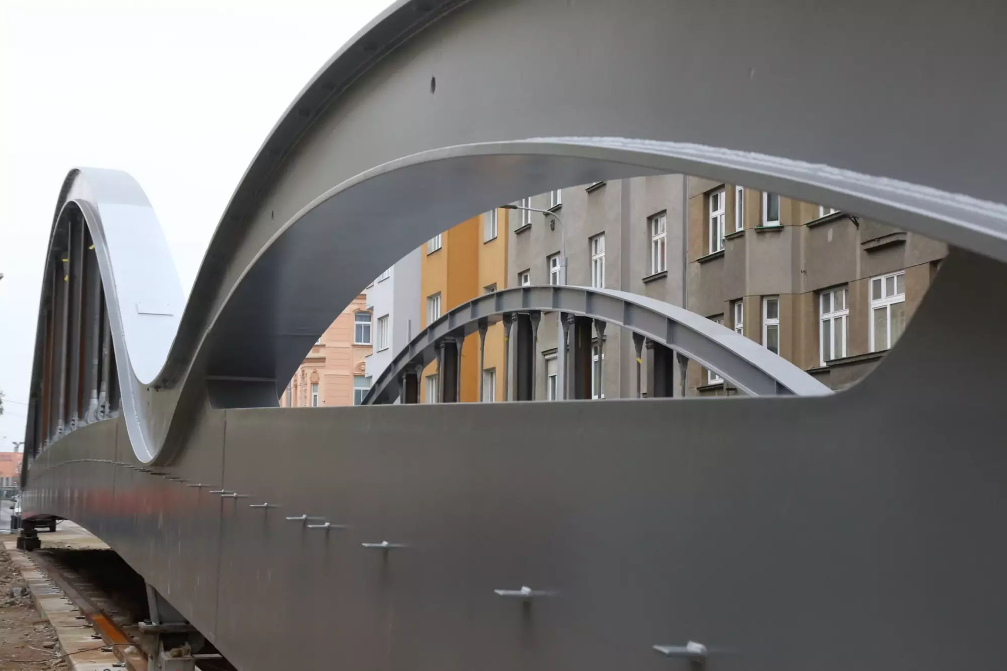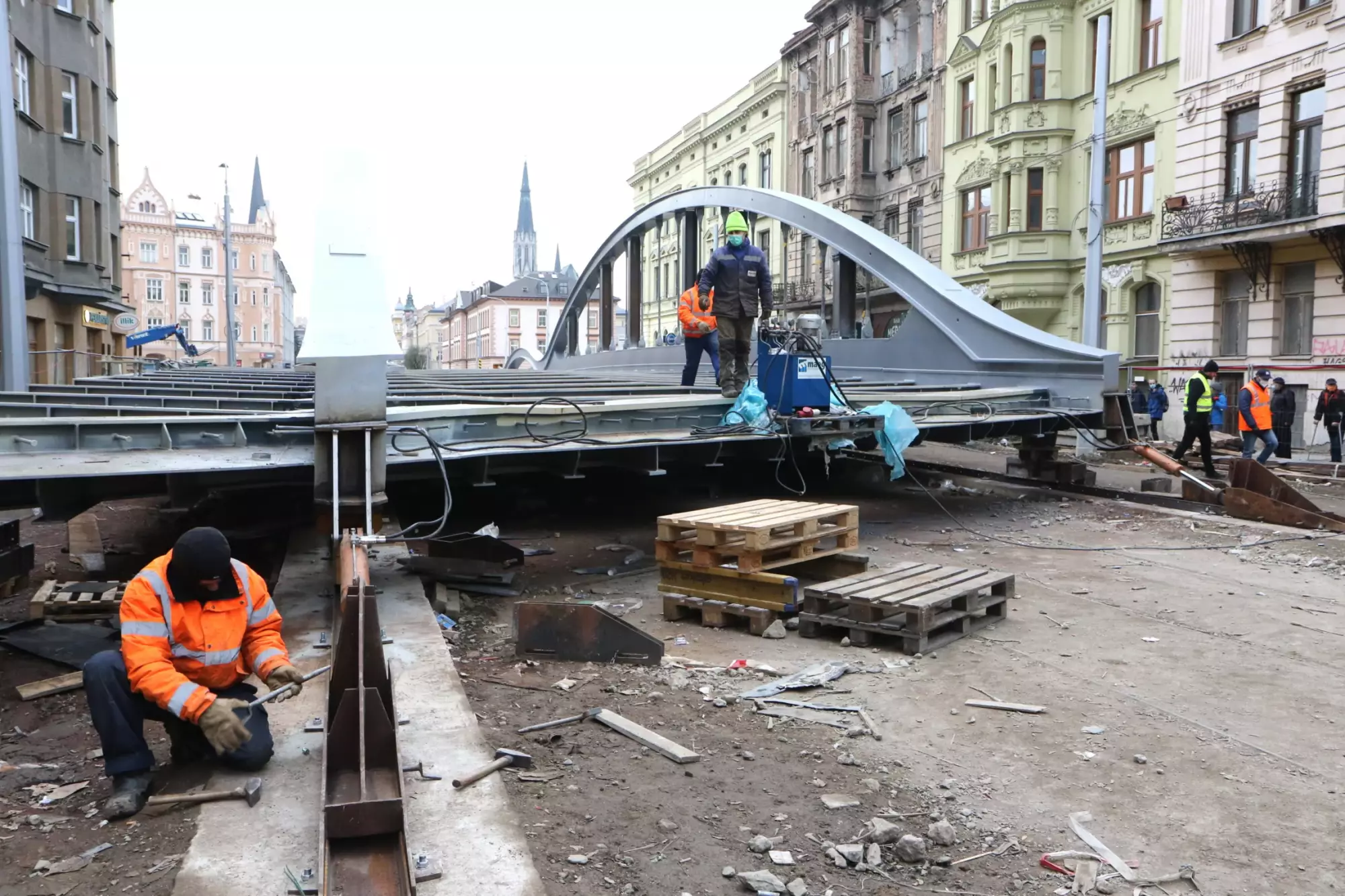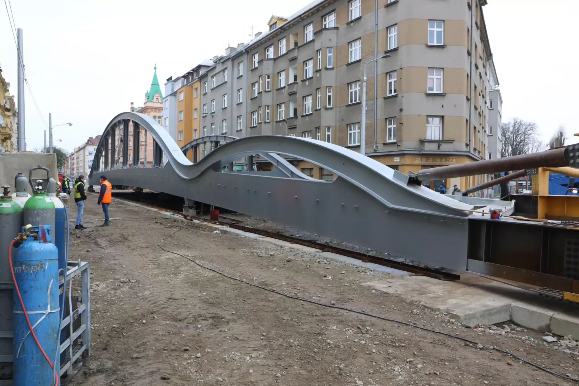 Konstrukce mostu na Masarykově třídě v Olomouci se začala ve čtvrtek 10. prosince vysouvat z ulice nad hladinu. Jedná se o ojedinělý technologický krok, protože kovová konstrukce poloviny mostu váží zhruba 295 tun, s přídavnou pomocnou konstrukcí dokonce 320 tun. Vysouvání bude trvat asi deset dní, během této doby bude z bezpečnostních důvodů uzavřena i lávka pro pěší. Chodci musí zvolit náhradní trasu přes most v Komenského ulici. Nicméně dnes zatím ještě přes lávku procházet mohli.