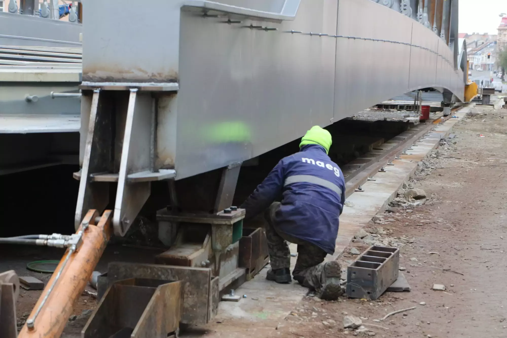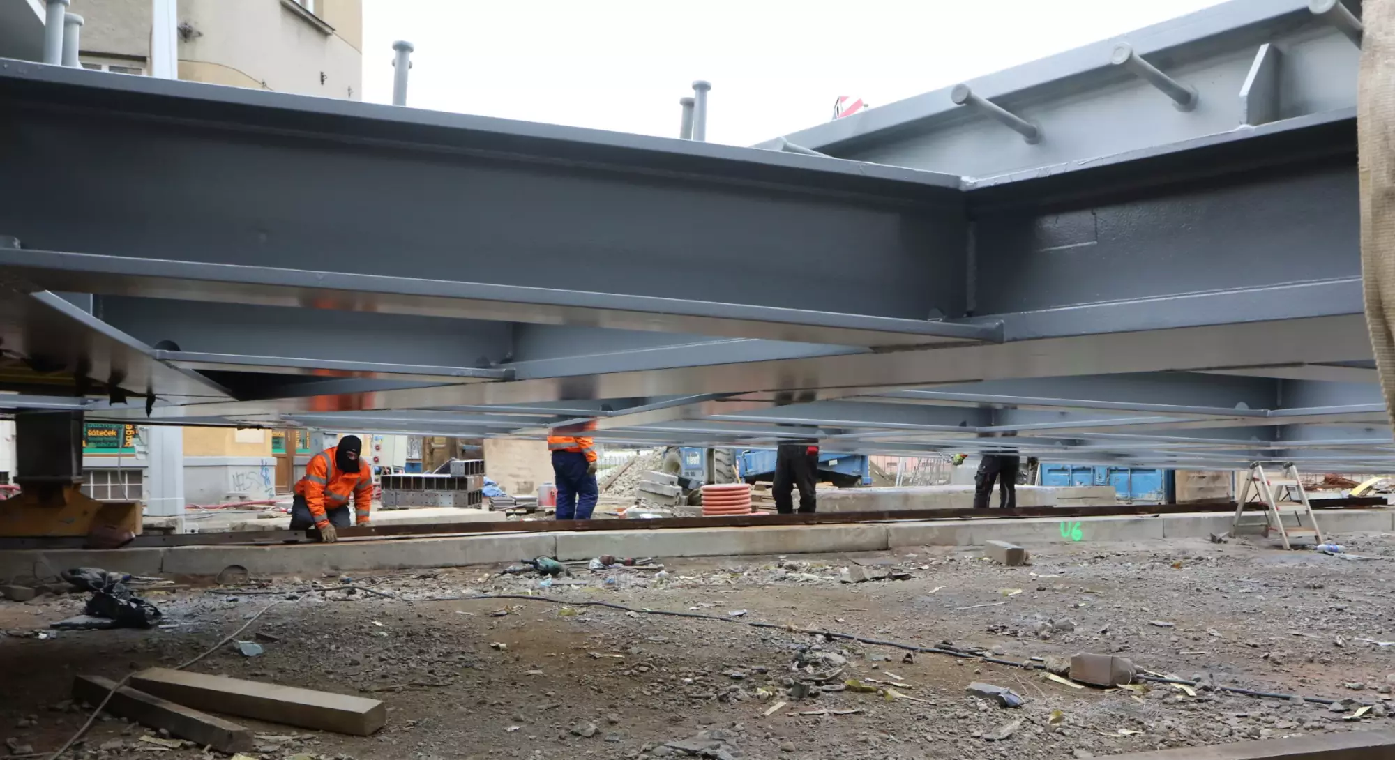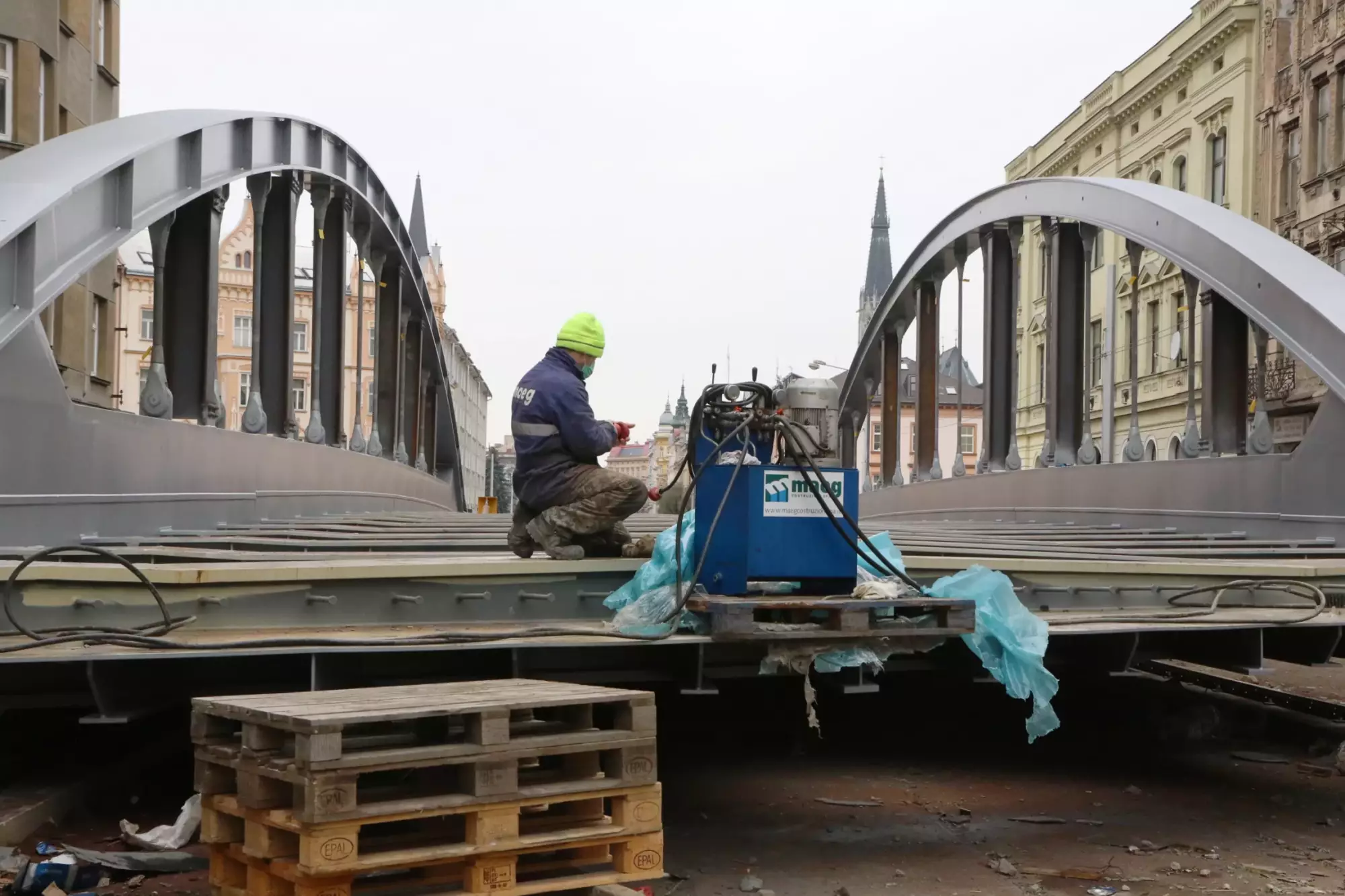 Od září montovali v Olomouci na Masarykově třídě dělníci komponenty nového mostu. Ty byly vyrobeny ve specializované italské firmě Maeg Montevarchi, pracovníci firmy byli přítomni i kompletaci dílů v Olomouci a nechybí ani nyní při stěhování mostu. Jednotlivé části dělníci postupně montovali, svařovali, natírali a připravovali na nasunutí. Konstrukce dlouhá 55 metrů je nyní připravena pro usazení na povodní stranu rekonstruovaného mostu (strana blíže vysokoškolským kolejím). Technicky a organizačně náročné vysouvání začalo ve čtvrtek.